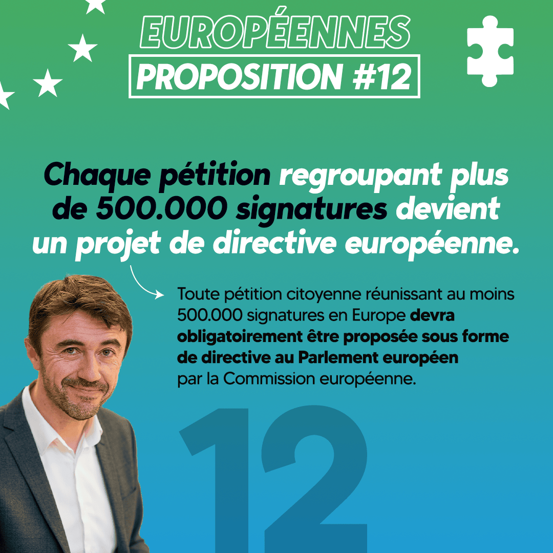 - Que toute pétition citoyenne réunissant au moins 500 000 signatures en Europe soit obligatoirement proposée sous forme de directive au Parlement européen par la Commission européenne.