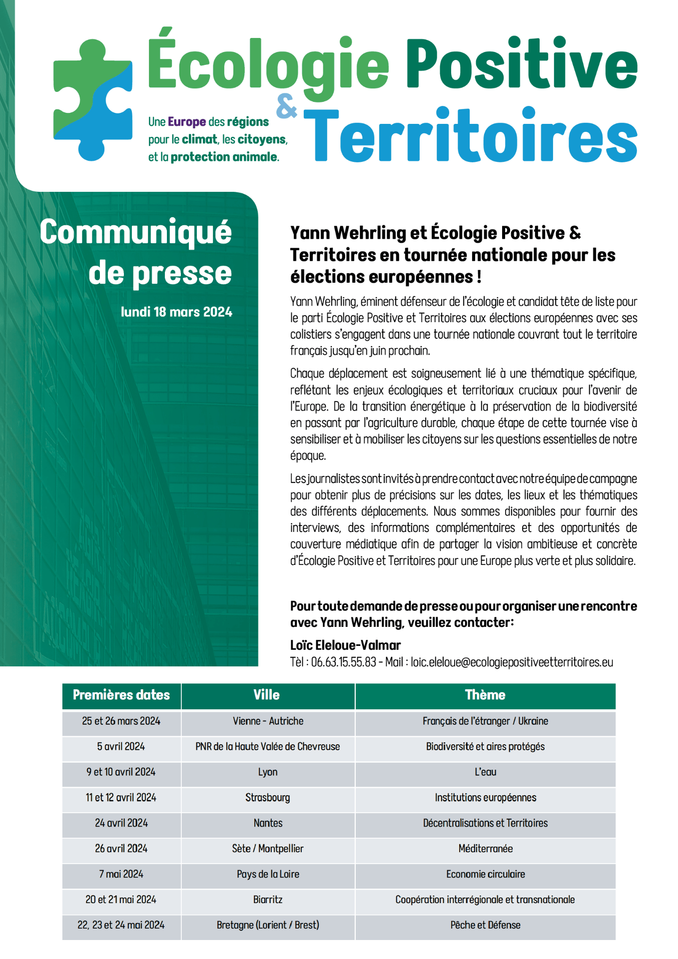 La presse commence à relayer les dates des déplacements de Yann Wehrling et des colistiers d'Écologie Positive et Territoires ! Retrouvez-nous près de chez vous au cours de la campagne des élections européennes.