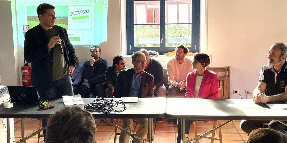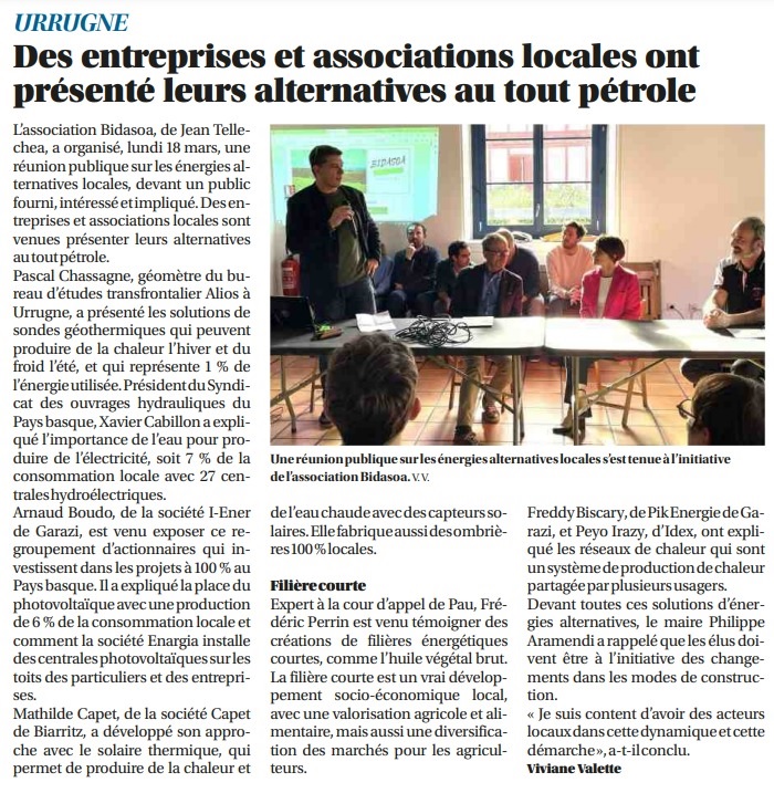 Lundi dernier, notre 9ème de liste Jean Tellechea organisait, avec son association Bidasoa, une réunion sur les alternatives énergétiques locales à Urrugne (photo Sud-Ouest V. V.).